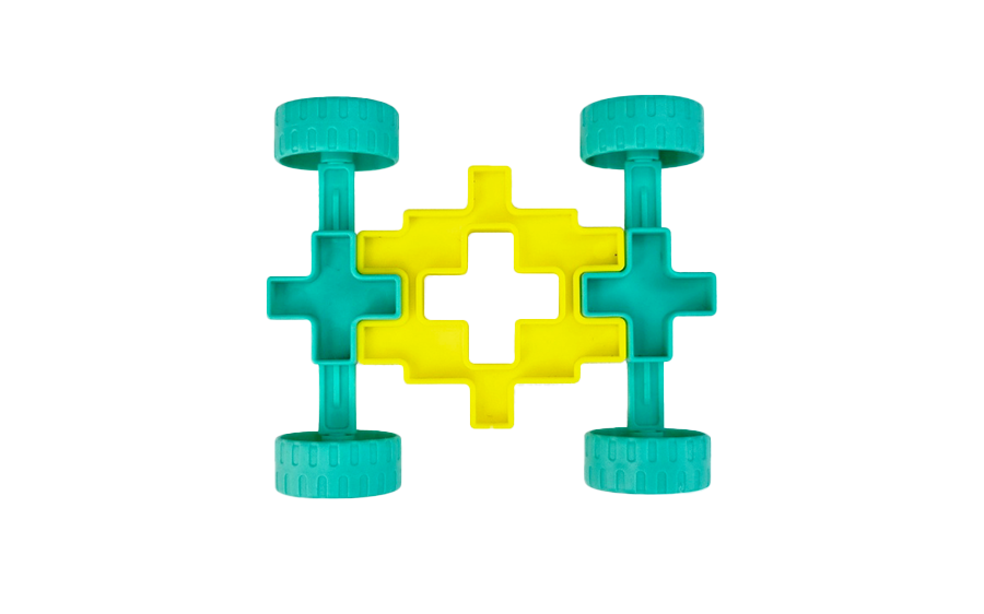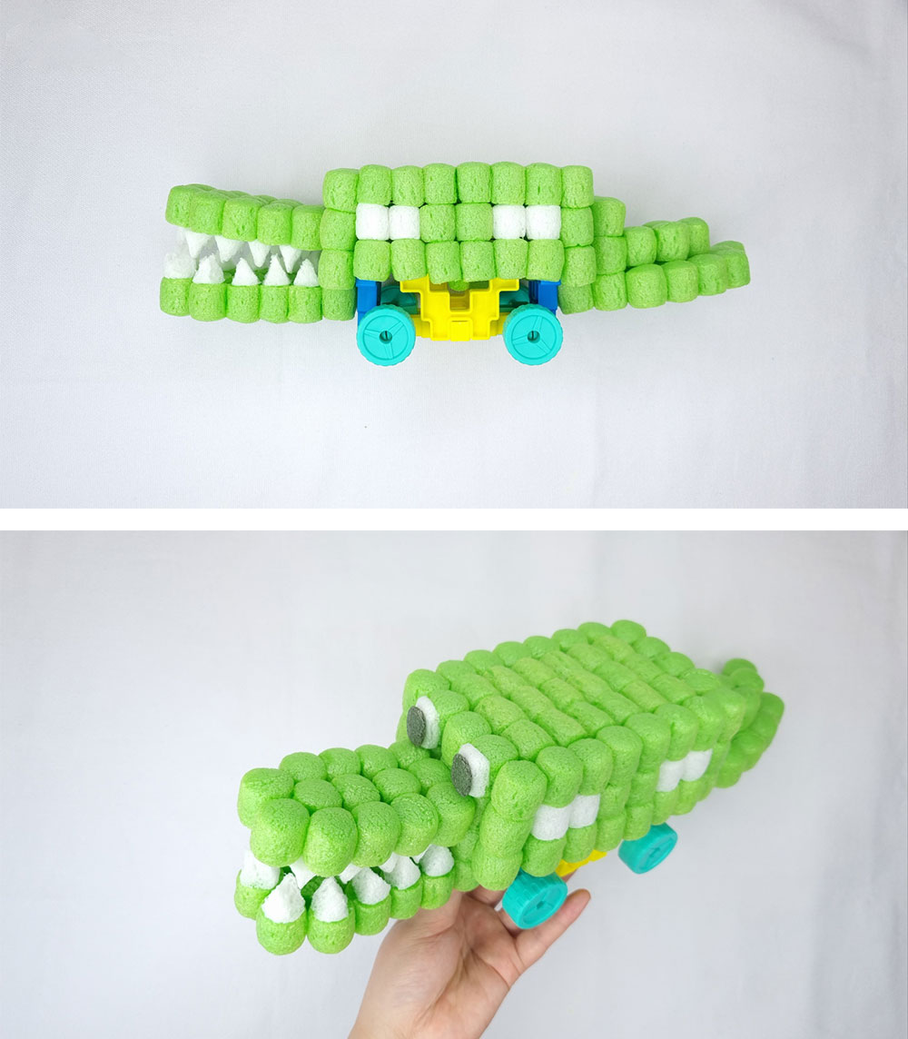 악어가 움직일 수 있게 밑부분에 바퀴를 달고 크기에 맞춰 블록을 끼워주세요.